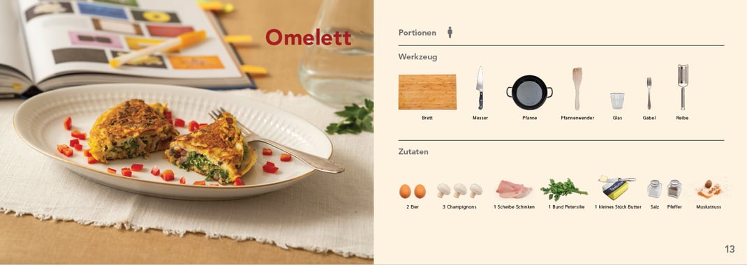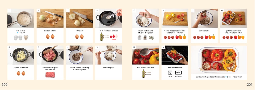 Sprache kommt in diesem Kochbuch kaum „zu Wort“. Stattdessen dominieren selbsterklärende Fotos. Das macht, auch dank der frischen und leichten grafischen Gestaltung, das Durchblättern zum besonderen Erlebnis und das Nachkochen zum Kinderspiel. Foto für Foto – Schritt für Schritt. Dank dem ausgeklügelten Zusammenspiel von Symbolen und Bildern gelingen Gerichte nicht nur, es macht auch richtig Freude, die Rezepte umzusetzen.